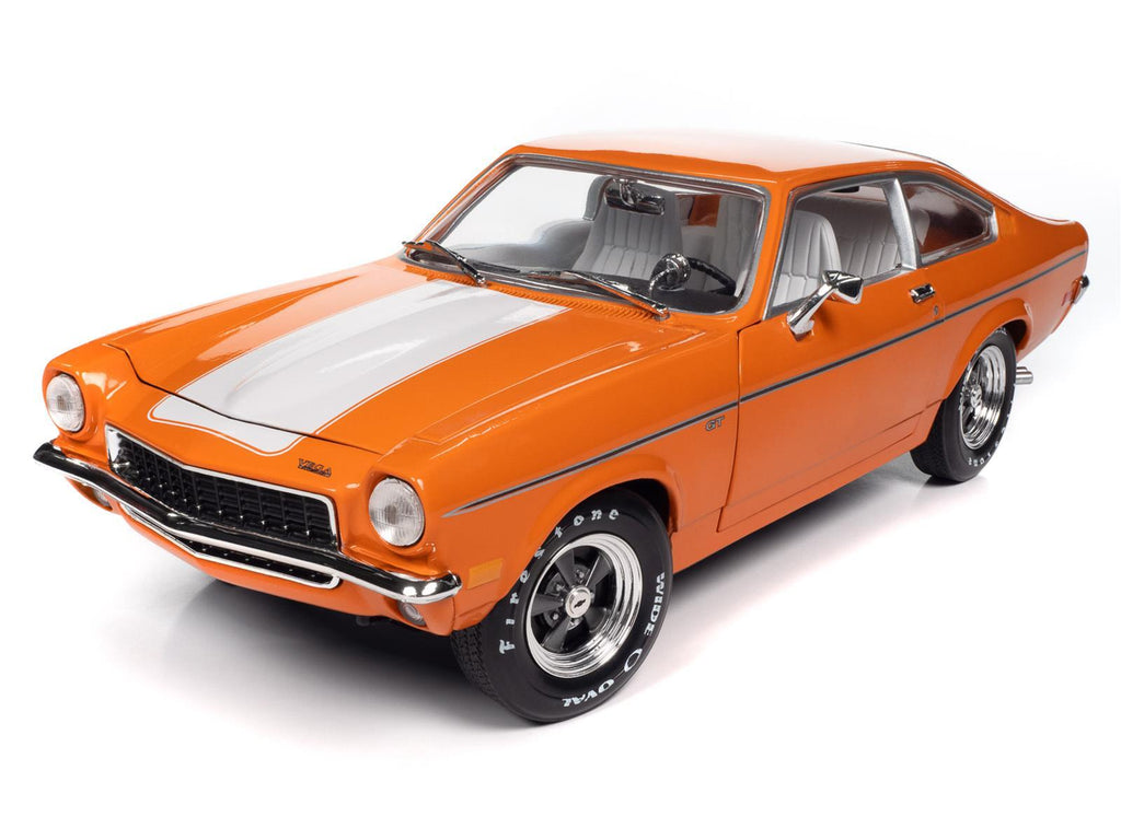 Collectable Cars, 1:18 Scale, 1973 Chevy Vega GT, Class of 1973 Series, Hugger Orange, Racing Stripes, Opening Doors/Hood/Trunk, Diecast Model, Each