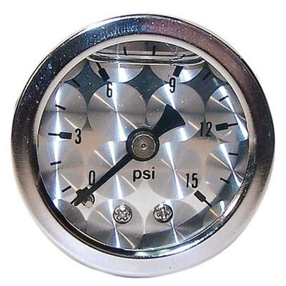 Gauges, Fuel Pressure, Liquid Filled, Analog, Mechanical, 1.50 in. Diameter, 0-15 psi, Full Sweep, Silver Face, Black Pointer, Silver Bezel, Each