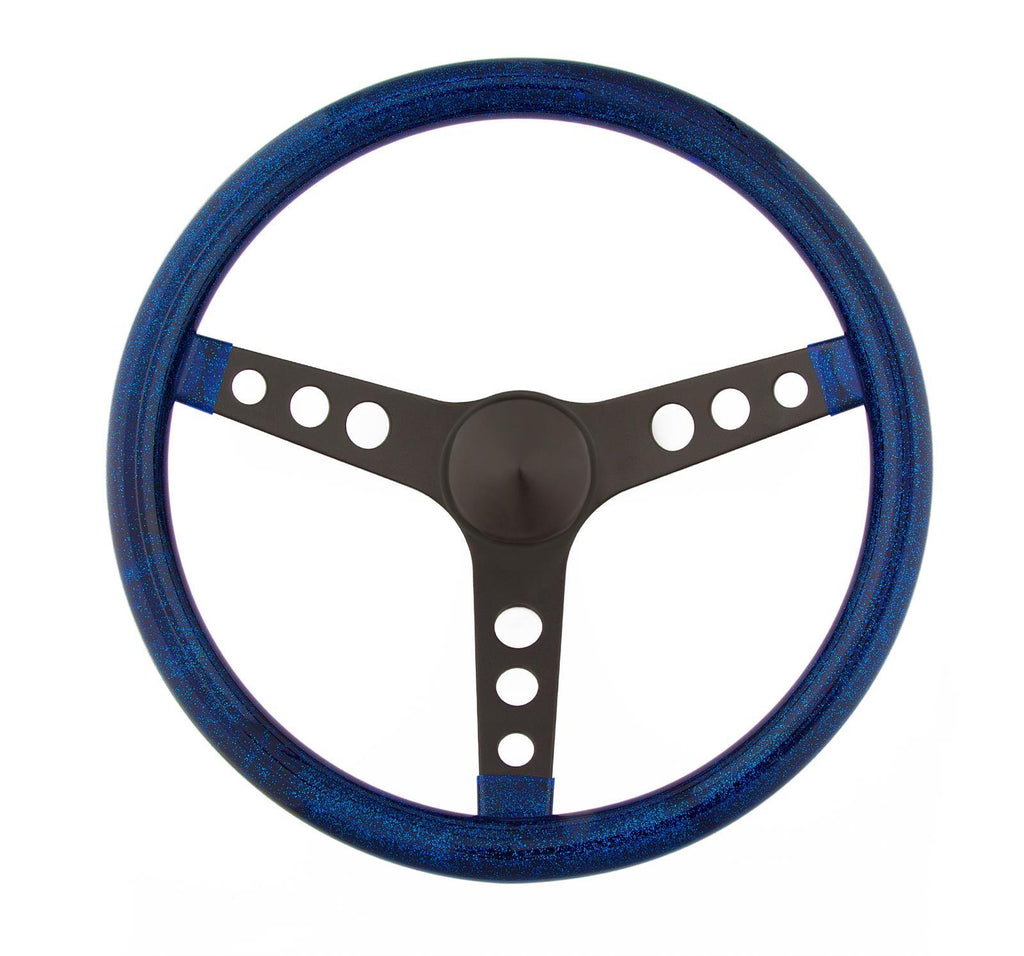 Steering Wheel, Metal Flake, 3-spoke, Blue Vinyl, Black Powdercoated Steel Spokes, 15 in. Dia., 3-Bolt, Each
