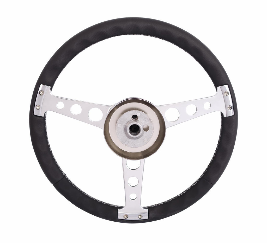 Steering Wheels, Billet Classic Series, 14.0 in. Diameter, Aluminum, 3-Spoke, Black, Leather Grip, Black, with Installation Kit, Horn Cap, Chevy, Kit